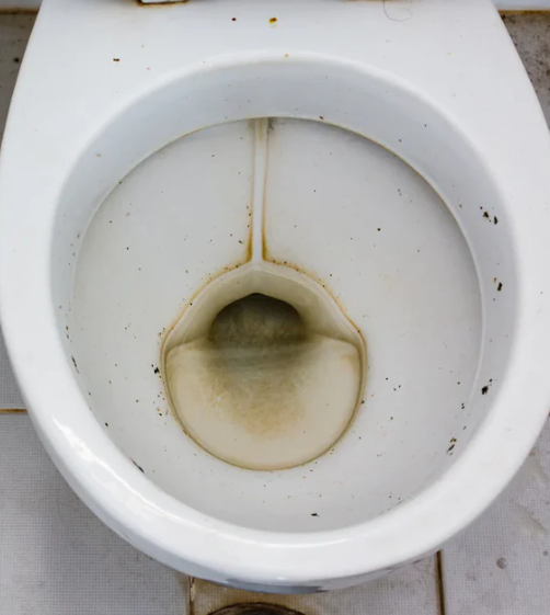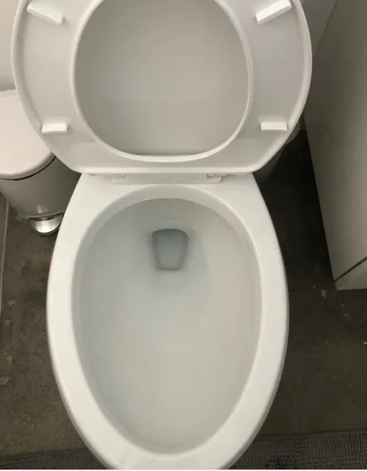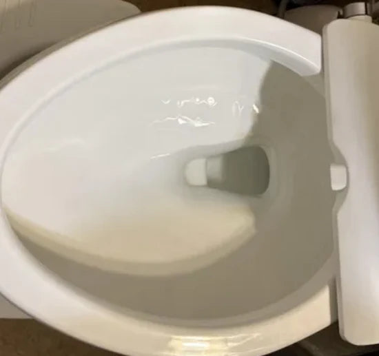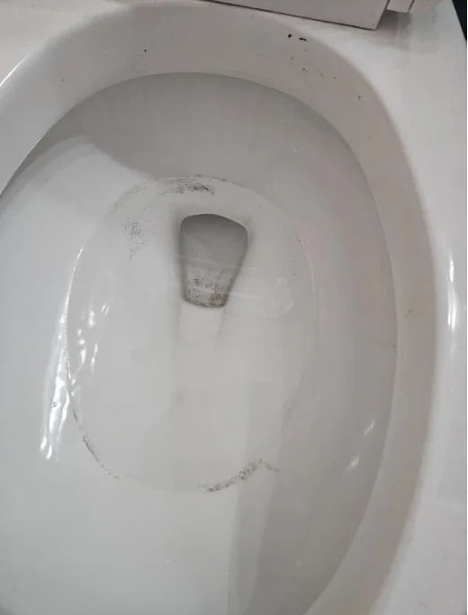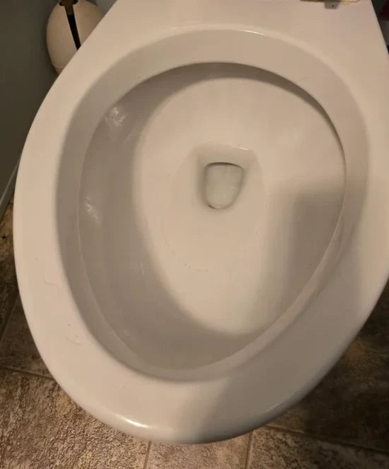 On the left: Years of mineral buildup, stains and rust. On the right: the same toilet after Toilet Bowl Cleaner- Spotless, polished and maintenance free