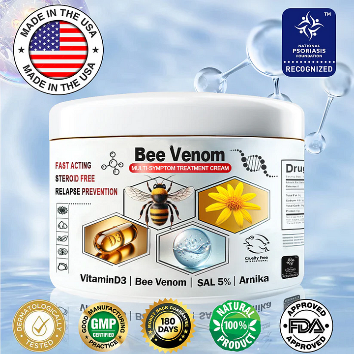 Our 𝑩𝒆𝒆 𝑽𝒆𝒏𝒐𝒎 𝑴𝒖𝒍𝒕𝒊-𝑺𝒚𝒎𝒑𝒕𝒐𝒎 𝑺𝒌𝒊𝒏 𝑻𝒓𝒆𝒂𝒕𝒎𝒆𝒏𝒕 𝑪𝒓𝒆𝒂𝒎 is safe for individuals allergic to bees, due to its carefully formulated ingredients and the strong support provided by rigorous testing to ensure both safety and efficacy.